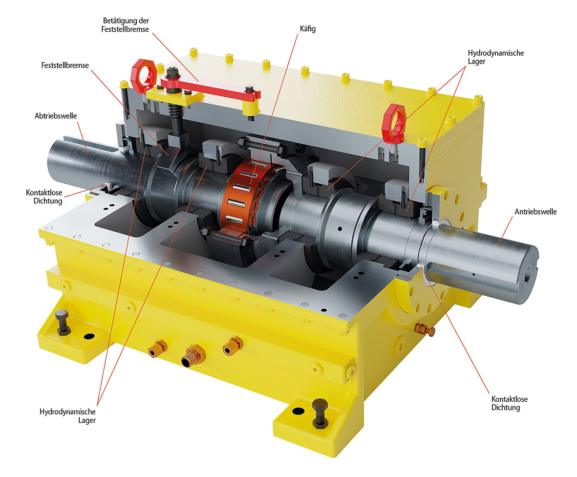 Gehäusefreiläufe werden vorrangig als automatisch arbeitende Überholkupplungen in Mehrmotoren-Antrieben eingesetzt. Sie gelten als Alternative zu aufwendigen Schalteinrichtungen. Ein technisches Highlight der Gehäusefreiläufe von RINGSPANN ist die hydrodynamische Klemmrollenabhebung. Hierbei wird die Abhebekraft der Klemmrollen durch einen Ölfilm erzeugt, der im Leerlaufbetrieb mit Zentrifugalkraft auf die Laufbahn des Außenrings aufgebracht wird. Das ermöglicht den praktisch verschleißfreien Leerlaufbetrieb.